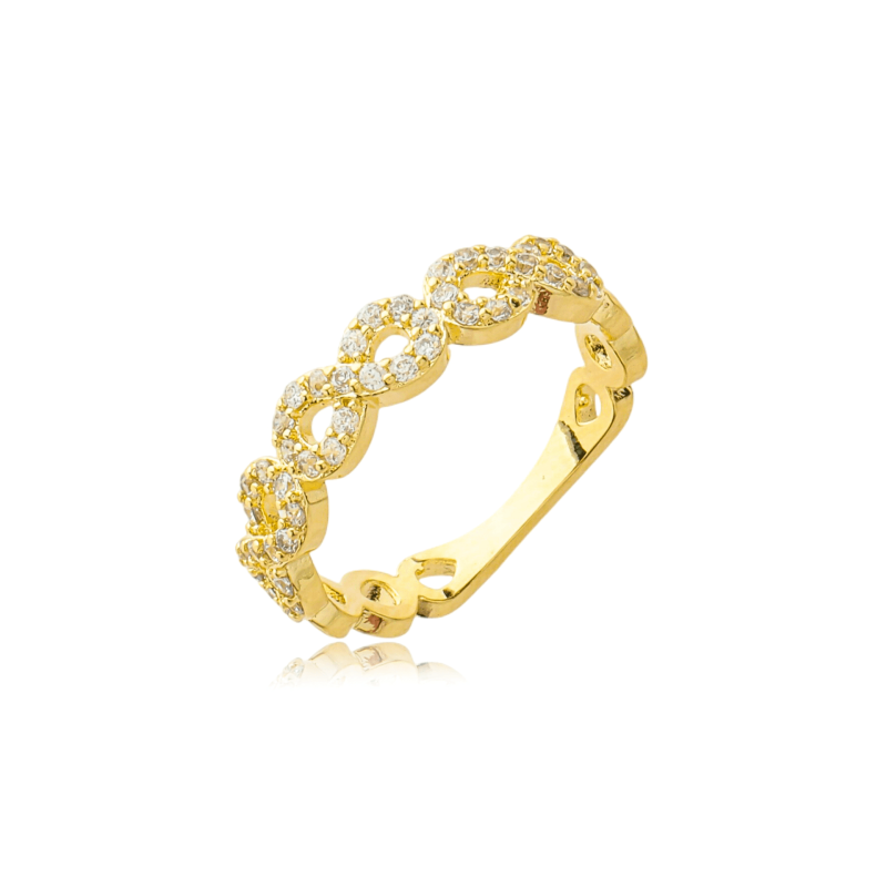 Anel infinito zirconia banhado a ouro 18kOs aneis delicados são clássicos da semijoias, com seus detalhes e designer super modernos. Com certeza chamam a atenção. São peças essenciais no mostruário e indispensaveis na produção de qualquer look ou produção.
