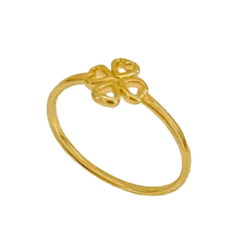 Anel tendo a sua superfície lisa e levemente fina, ao centro há um trevo de quatro folhas todo liso, com detalhes vazados. banhado a ouro 18k.O anel liso é super atemportal, sendo um sucesso, trazendo consigo delicadeza e modernidade, com certeza essenciais em qualquer mostruário! Além de lindos são super versáteis, ideal tanto para o dia a dia como para aquela ocasião especial! Faça seu estilo, use semijoias! Aposte em mix delicados ou use-o só, você ira arrasar!