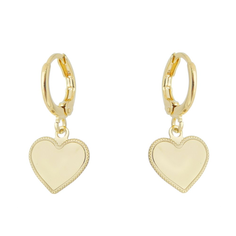 Argola articulada, banhada a ouro 18k, tendo sua base lisa e levemente fina, tendo como pingente um coração liso ao centro, estilo plaquinha com detalhes trabalhados nas bordas do pingente, tornando a peça super linda e delicada.Peças com o tema de coração, são clássicas que nunca saem de moda, aposte neste tema e não se arrependa, são as chamadas peças coringas, que combinam com tudo