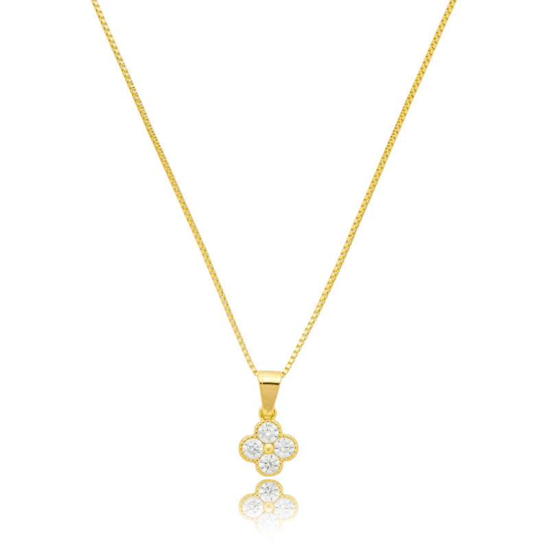 Gargantilha tendo a sua corrente fina, nela há um pingente em formato de trevo, ele é formado por quatro zircônias de tamanho maior, o seu caule e sua borda são lisos. Banhado a ouro 18k.As gargantilhas estão cada vez mais em alta no mundo da semijoia, com certeza essenciais para deixar um look ainda mais lindo, ideal para qualquer ocasião e estação, seja ela mais casual ou despojada. Sendo super versátil a peça combina com qualquer formato de rosto. Além de ser linda quando usada só, pode ser incrementada com uma composição linda ou um mix de colares, com certeza são indispensáveis no seu mostruário.